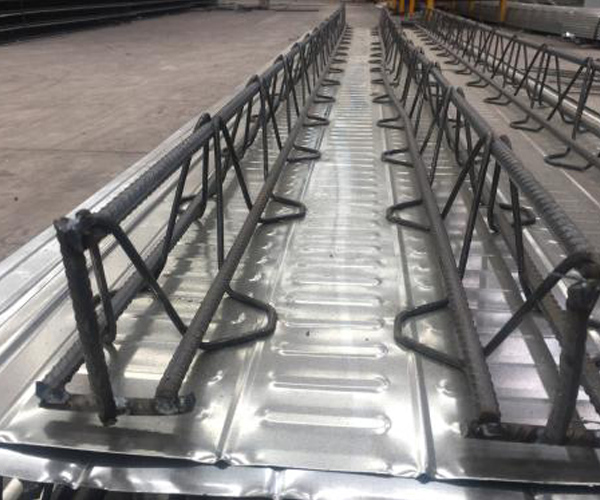 (4)钢筋桁架楼承板就位之后,应将其端部的竖向钢筋及底模与钢梁点焊牢固。沿板宽度方向将底模与钢梁点焊,焊接采用手工电弧焊,间距不大于300mm。