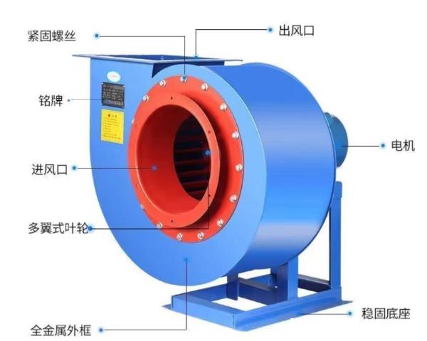 一般主要由鼓形壳体、过载热保护外转子电机、高效离心叶轮等部件组成。叶轮由多个后倾式圆弧形铝合金叶片、前盘、后盘组成,经静动平衡校验,运行平稳可靠。壳体材质有镀锌钢板、不锈钢板或玻璃钢等,根据不同需求选择。
