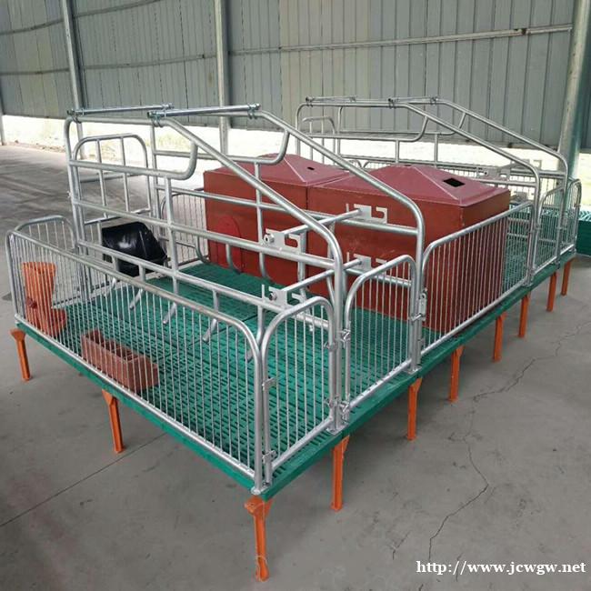 母猪产床,主体采用热浸锌管或喷漆管焊接,使其结构 合理,经济实惠,质量和寿命大幅提高,成为各大规模化养猪厂的 ,仔猪塑料地板,母猪球墨铸铁地板,扁钢大梁支撑。含母猪食槽,仔猪圆形补料槽,保温箱,电热板。